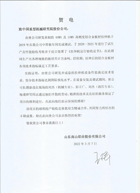 近日,由我院管棒型材工程事业部管棒所成套供货的山东南山铝业股份有限公司(以下简称“南山铝业”)40MN及10MN高精度铝合金板材拉伸机项目顺利通过性能考核并完成用户的最终验收。