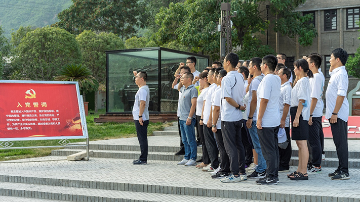 “我志愿加入中国共产党,拥护党的纲领……”参观结束后,支部全体党员在党旗前庄严肃立,重温入党誓词,感悟初心使命。