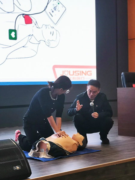 培训老师专业的讲解,深入浅出地教会员工判断人是否有意识、是否心跳停止呼吸、是否需要心肺复苏,并引导员工学习心脏骤停的原理和类型、心肺复苏(CPR)的七大流程、自动除颤仪(AED)的实操注意事项。观看老师演示后,员工们踊跃参与实践,进行心肺复苏和自动除颤仪的模拟练习。同时,培训老师为大家细致耐心指导,力求模拟实践做到动作规范、标准、有效。