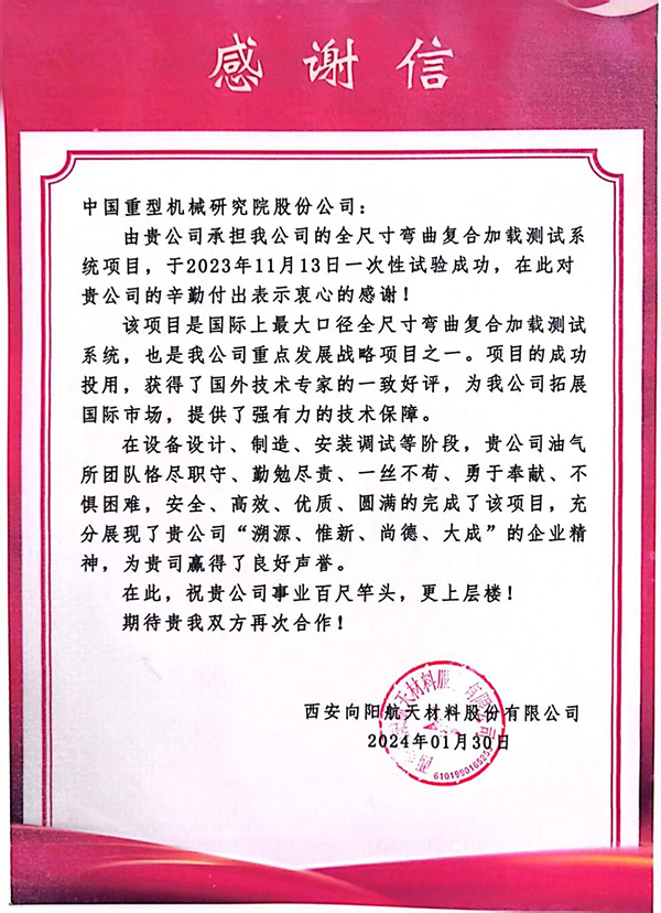 张立君首先对全尺寸弯曲复合加载测试系统项目的一次性试验成功表示由衷的感谢和高度赞赏,并为中国重型院油气所送上感谢信。他表示,该项目是国际上最大口径的全尺寸弯曲复合加载测试系统,该项目的成功实施获得了国外技术专家的一致好评,为西安向阳航天材料股份有限公司拓展国际市场提供了强有力的技术保障。期望双方通过该项目的顺利实施,再接再厉,继续深化彼此沟通协作,巩固业务合作基础,达成互利共赢目标,助力企业高质量发展。