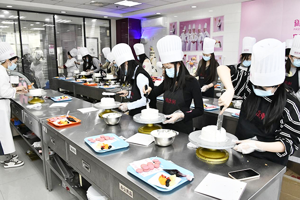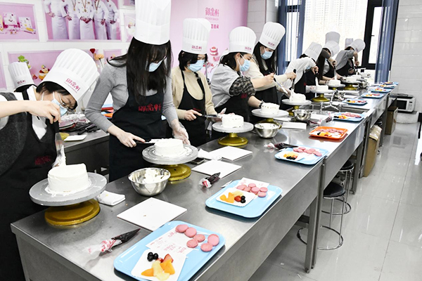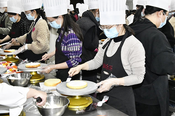 进入烘焙工坊,在蛋糕老师的教学下,大家戴上蛋糕帽、系好烘焙裙,聚精会神地跟随烘焙老师的讲解和演示,制作着属于自己的小蛋糕。从蛋糕胚的组合摆放,奶油的抹面,再到最后的造型装饰,大家现学现做,一双双灵巧的手制作出一个个独具匠心的蛋糕,也编织出幸福与欢乐。