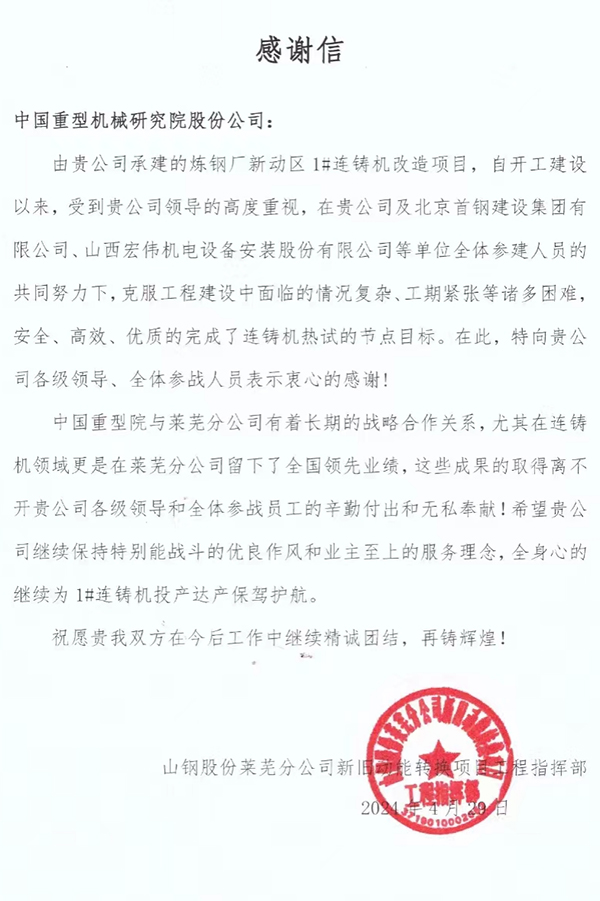 该项目要求高、工期紧,项目组机电液专业人员精诚协作、加班加点,提前26天完成了连铸机热试总目标。团队凭借扎实的技术实力和优质的现场服务,为用户成功打造精智连铸产线,助力莱钢集团提升优势产能,增强市场竞争力。更以实际行动生动彰显了中国重型院深厚的专业技术水平和团队凝聚力,诠释了“做到极致,挑战极限”的新时代连铸人的精神风貌。